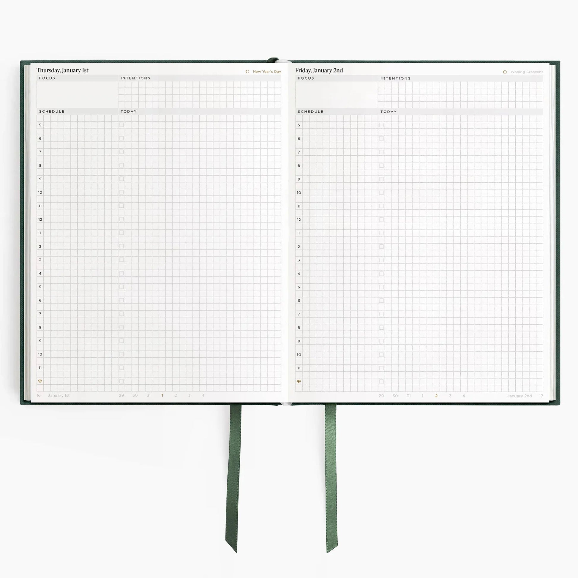 Each book contains 208 pages (416 total). Both elevated and practical with an hourly schedule and spacious to-do list. Perfect for those who desire an entire page per day with plenty of room to write down tasks, journal, or take notes.