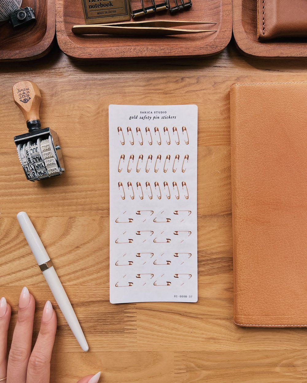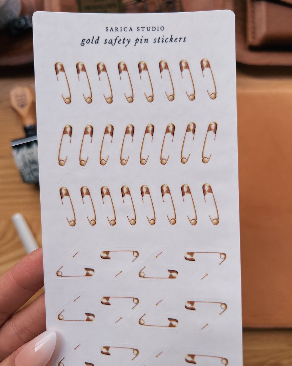 - Gold safety pin stickers for attaching ephemera to your pages
