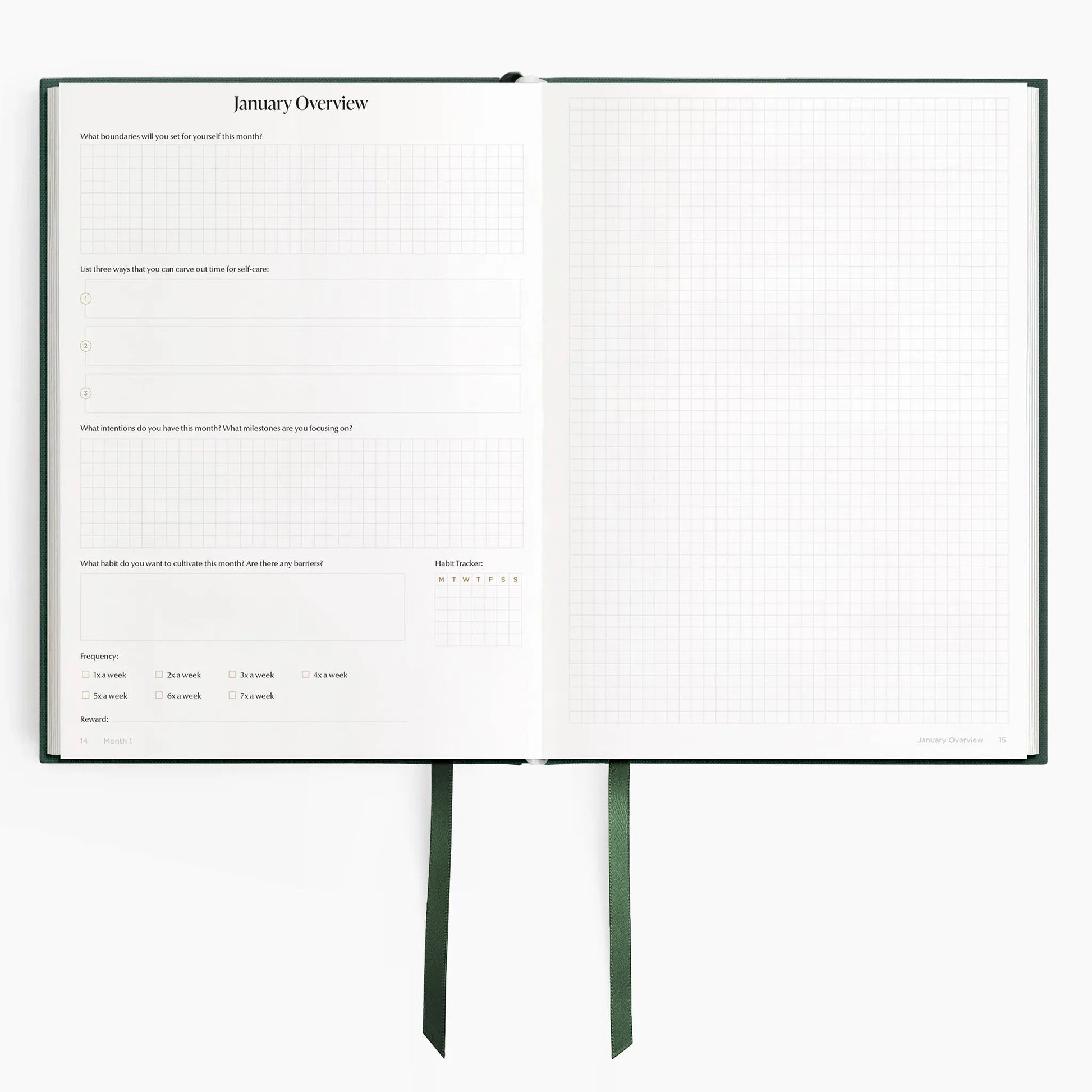 - Monatliche Reflexions- und Übersichtsseiten, um Gewohnheiten zu verfolgen und den Monatsfokus festzulegen